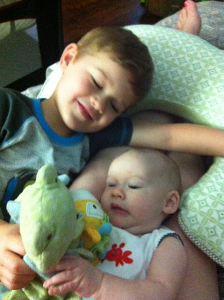 Every morning he comes to tell her good morning. Today he snuggles up and entertains her with his puppy. And even goes to look for hers. So, so thoughtful.