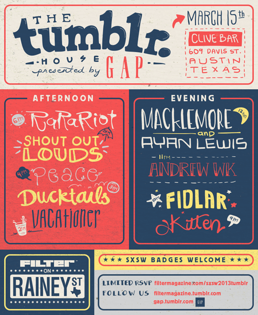 Posted bycmamantovFebruary 21, 2013July 25, 2014Posted inExtras filtermagazine: FRIDAY MARCH 15, 2013 TUMBLR + GAP = FILTER ON RAINEY SHOWCASE MANIA! RSVP NOW! Pretty cool marketing partnership Share this: Click to share on X (Opens in new window) X Click to share on Facebook (Opens in new window) Facebook Click to share on LinkedIn (Opens in new window) LinkedIn Click to share on Pinterest (Opens in new window) Pinterest Related