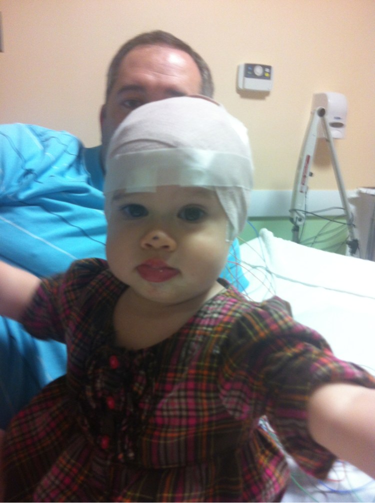EEG today to see if new meds produce a different picture of her brain’s activity. She didn’t cry this time. So brave and strong. I am so proud to be her mommy. The special head wrap makes her face look so round. Her cheeks were meant to be plump. She gained half a pound this past week. Now we just hope she can keep it on.