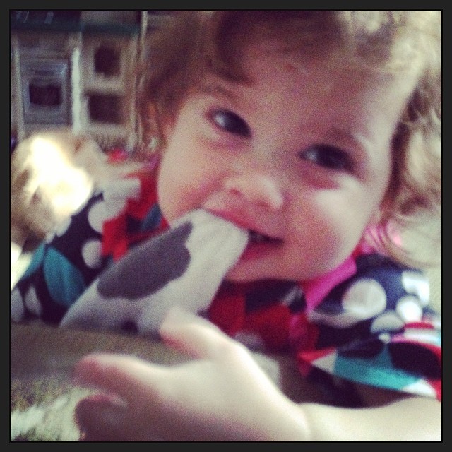 She was being so silly today. Got my attention, shook her head with blanket in mouth, giggled when I reached in for the tickle and collapsed to the floor so I had to come get her. Maybe she is more of a ham like Big D than we realized.