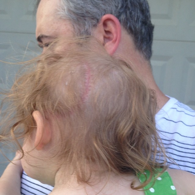 I was trying to see how red her hair is in the sunset, but ended up getting a straight on shot of the scar. I hate how it looks like the side of a baseball with the stitches in the perfect curve. #epilepsywarrior #brainsurgery