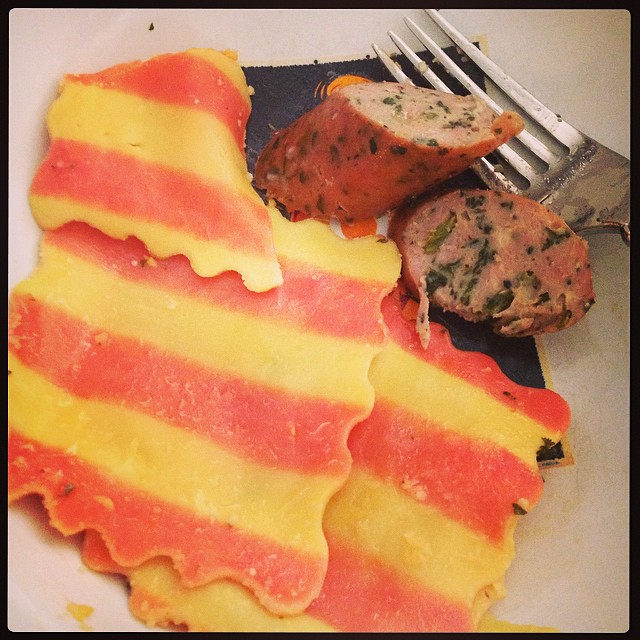 One of my favorite “hidden” meals. Organic chicken sausage with feta & spinach and organic butternut squash ravioli. Both kids love it! #healthyliving #yum #onthetable #sneakymom #hidetheveggies