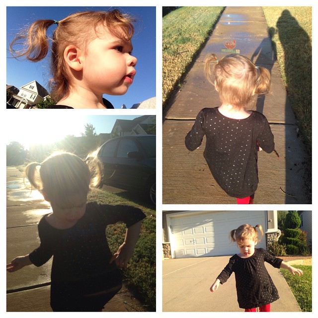 Took our pigtails on a walk this crisp morn. Getting her hair off her neck really makes her look more grown up. Yikes!